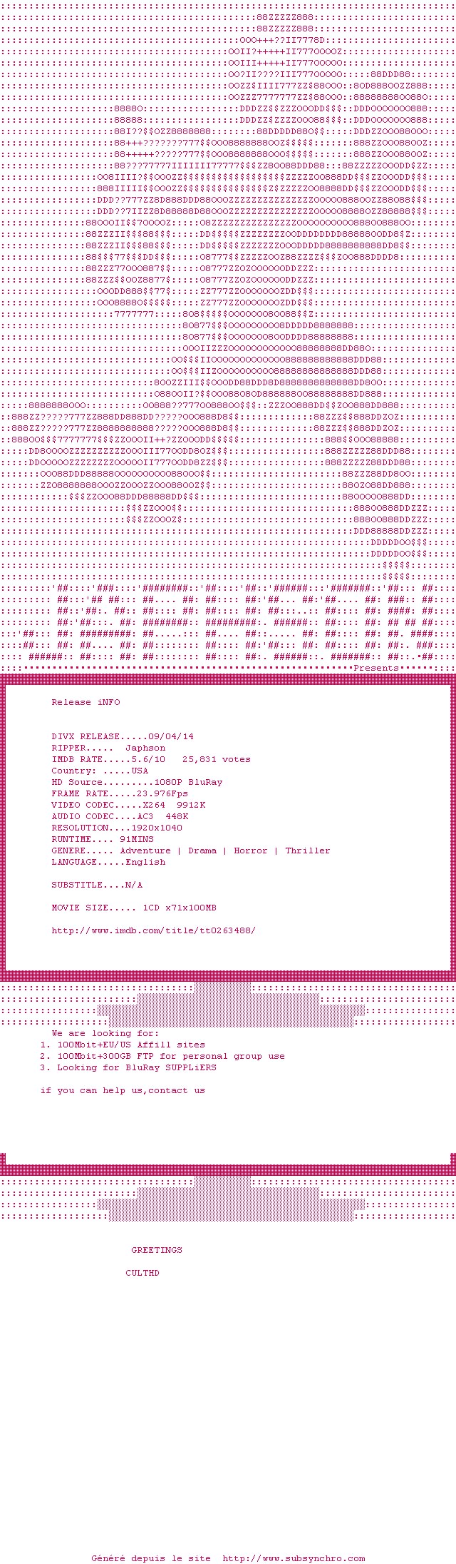 Voir le nfo de la release Jeepers.Creepers.2001.720p.BluRay.x264-DON