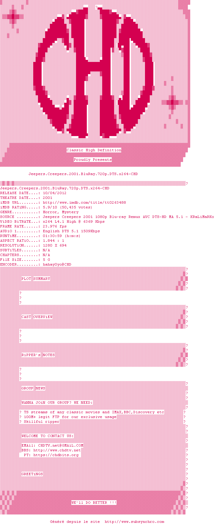 Voir le nfo de la release Jeepers.Creepers.2001.BluRay.720p.DTS.x264-CHD