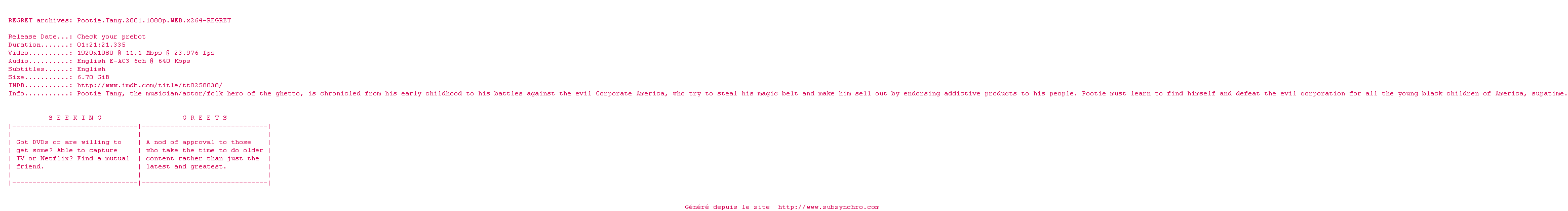 | Voir le nfo de la release Pootie.Tang.2001.1080p.WEB.x264-REGRET | REGRET | Pootie.Tang.2001.1080p.WEB.x264-REGRET OpenSubtitles | 0 fichier | ||