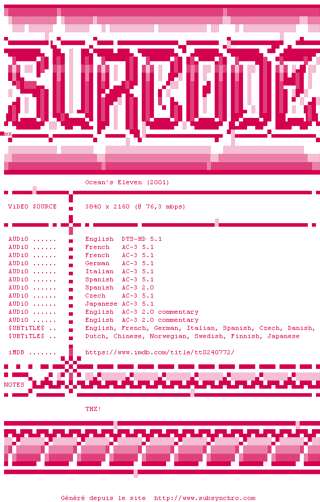 Voir le nfo de la release Oceans.Eleven.2001.2160p.UHD.BluRay.x265-SURCODE
