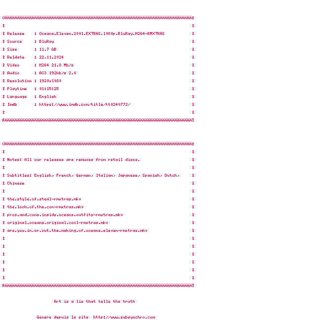 Voir le nfo de la release Oceans.Eleven.2001.EXTRAS.1080p.BluRay.H264-RMXTRAS