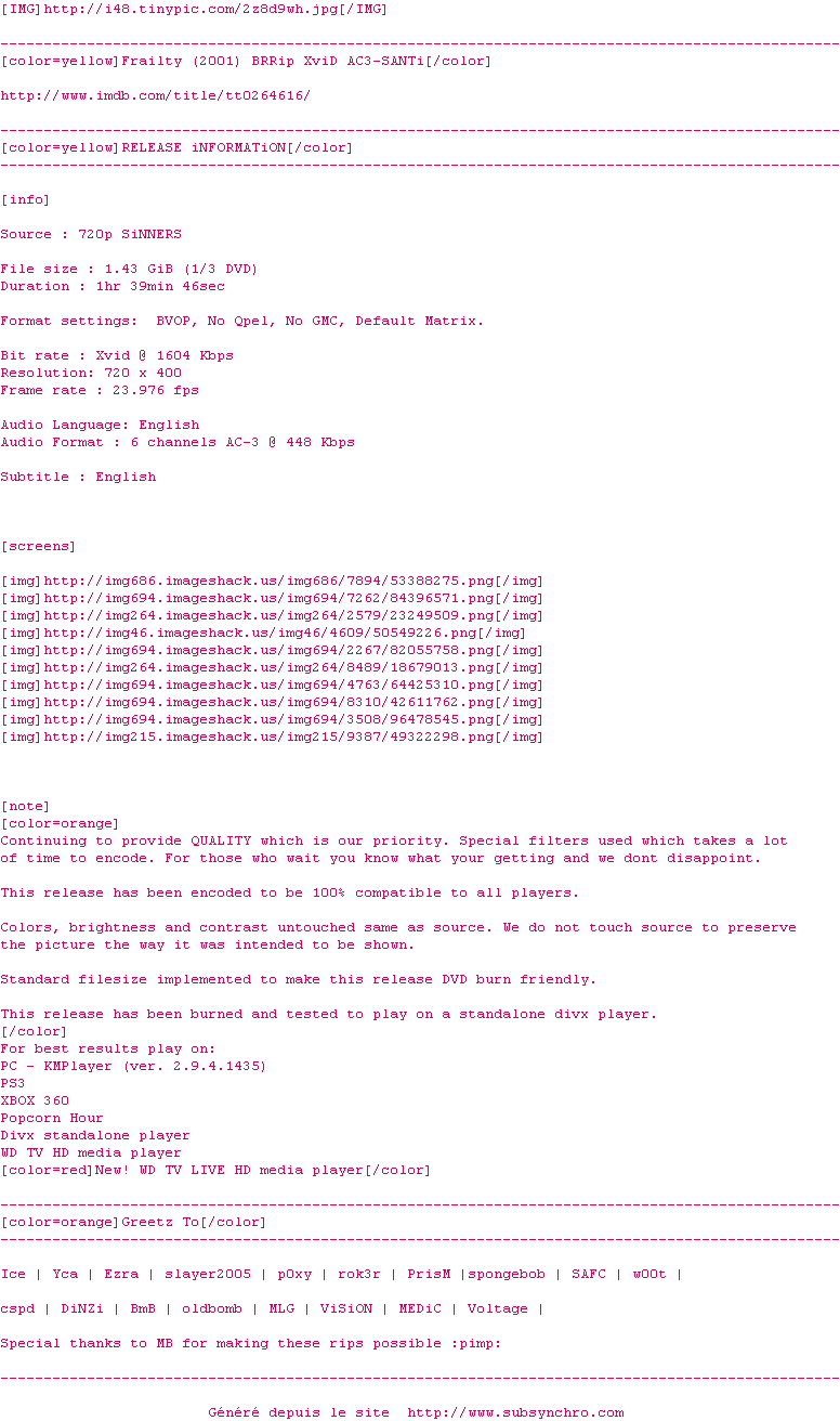 Voir le nfo de la release Frailty.2001.BRRip.XviD.AC3-SANTi
