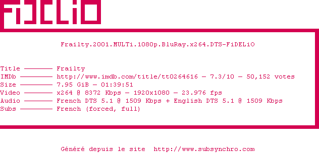 Voir le nfo de la release Frailty.2001.MULTi.1080p.BluRay.x264.DTS-FiDELiO