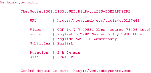 Voir le nfo de la release The.Score.2001.Remastered.1080p.BluRay.HEVC.x265.5.1-BONE