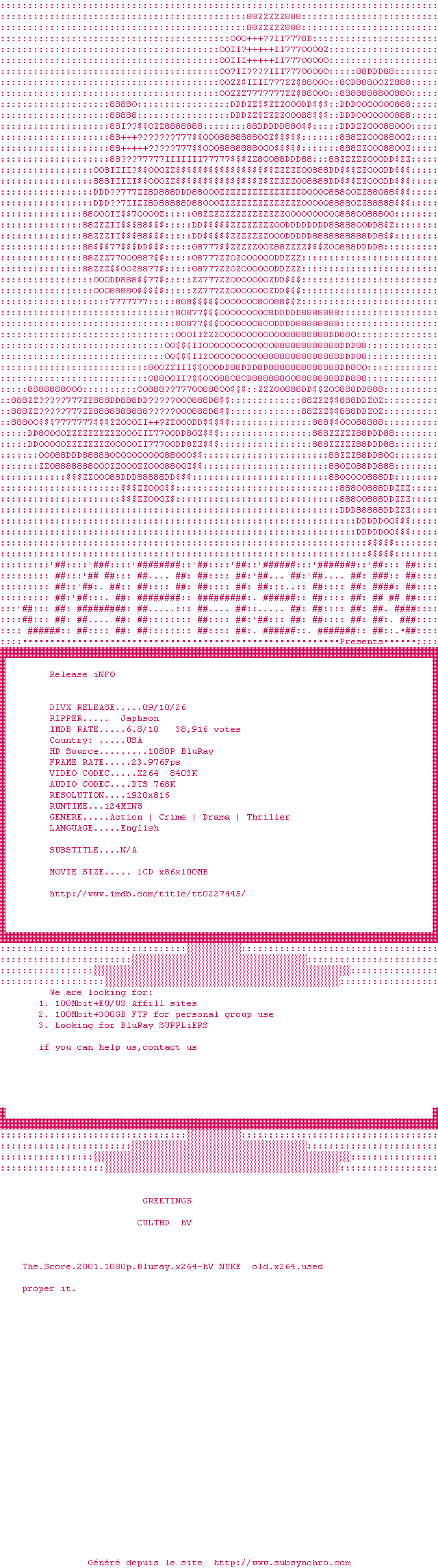 Voir le nfo de la release The.Score.2001.PROPER.1080p.BluRay.x264-Japhson
