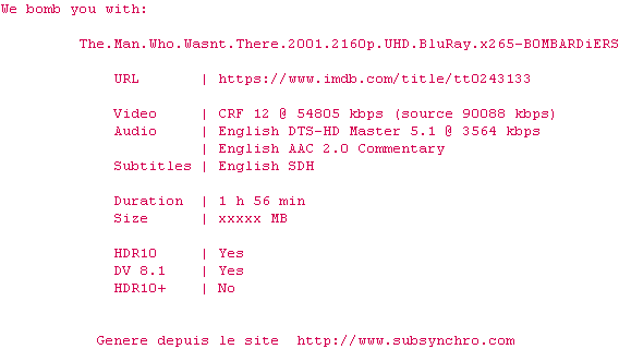 Telechargez le RSS « Fichier de la release The.Man.Who.Wasnt.There.2001.2160p.UHD.BluRay.x265-B0MBARDiERS »