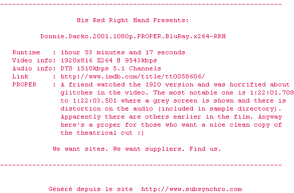Voir le nfo de la release Donnie.Darko.2001.1080p.PROPER.BluRay.x264-RRH