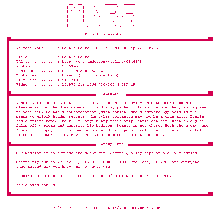 Voir le nfo de la release Donnie.Darko.2001.iNTERNAL.BDRip.x264-MARS