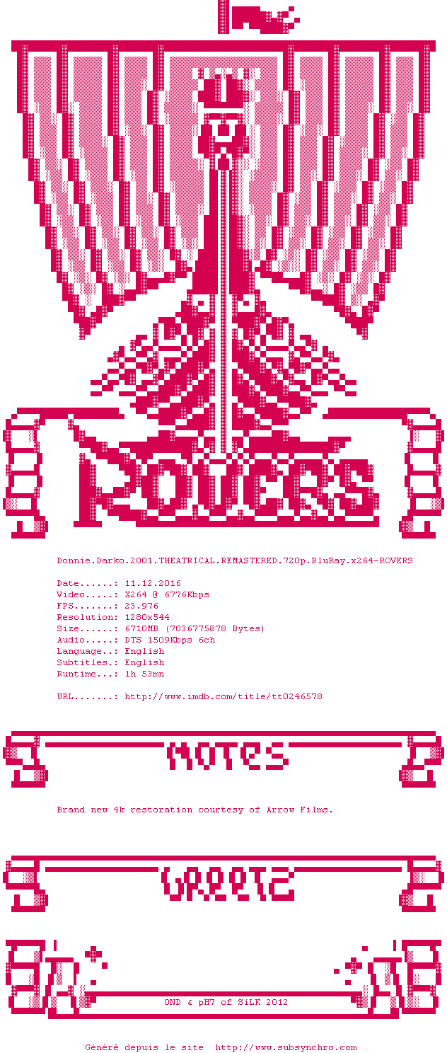 Voir le nfo de la release Donnie.Darko.2001.THEATRICAL.REMASTERED.1080p.BluRay.x264-ROVERS