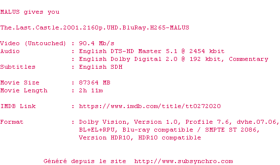 Voir le nfo de la release The.Last.Castle.2001.2160p.UHD.BluRay.H265-MALUS