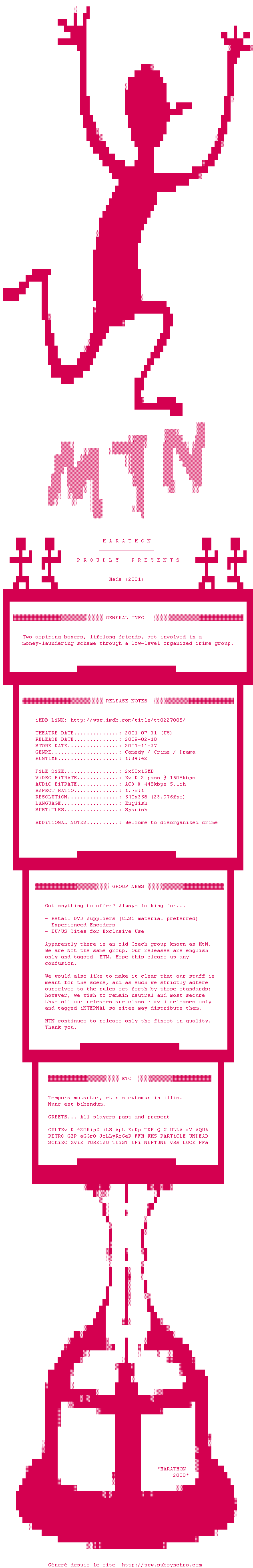 Voir le nfo de la release Made.2001.iNTERNAL.DVDRip.XviD-MTN