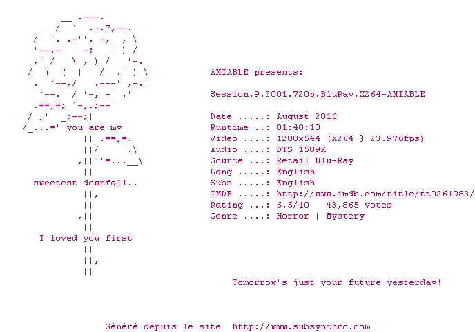 | Voir le nfo de la release Session.9.2001.720p.BluRay.x264-AMIABLE | AMIABLE | Session.9.2001.720p.BluRay.x264-AMIABLE OpenSubtitles | 07/09/2023 | Disponible en Z2 | 1 fichier |