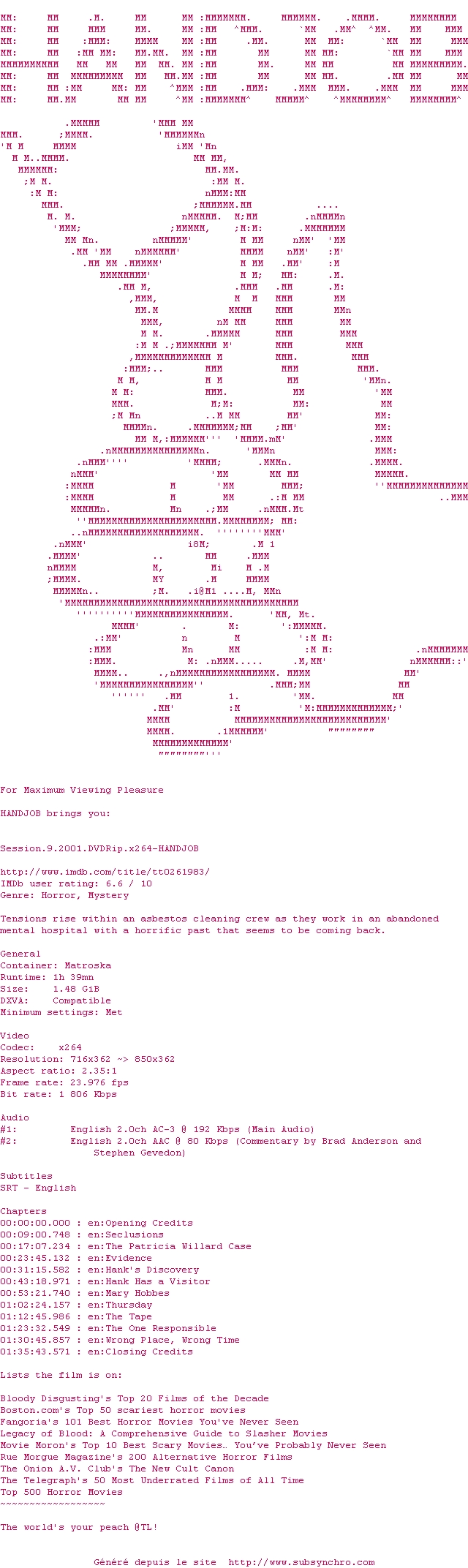 | Voir le nfo de la release Session.9.2001.DVDRip.x264-HANDJOB | HANDJOB | Session.9.2001.DVDRip.x264-HANDJOB OpenSubtitles | 0 fichier | ||