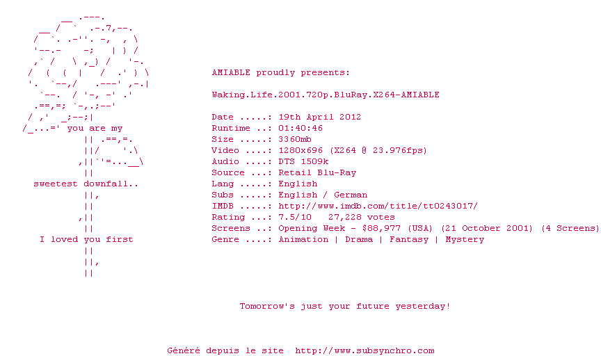 | Voir le nfo de la release Waking.Life.2001.720p.BluRay.X264-AMIABLE | AMIABLE | Waking.Life.2001.720p.BluRay.X264-AMIABLE OpenSubtitles | 0 fichier | ||