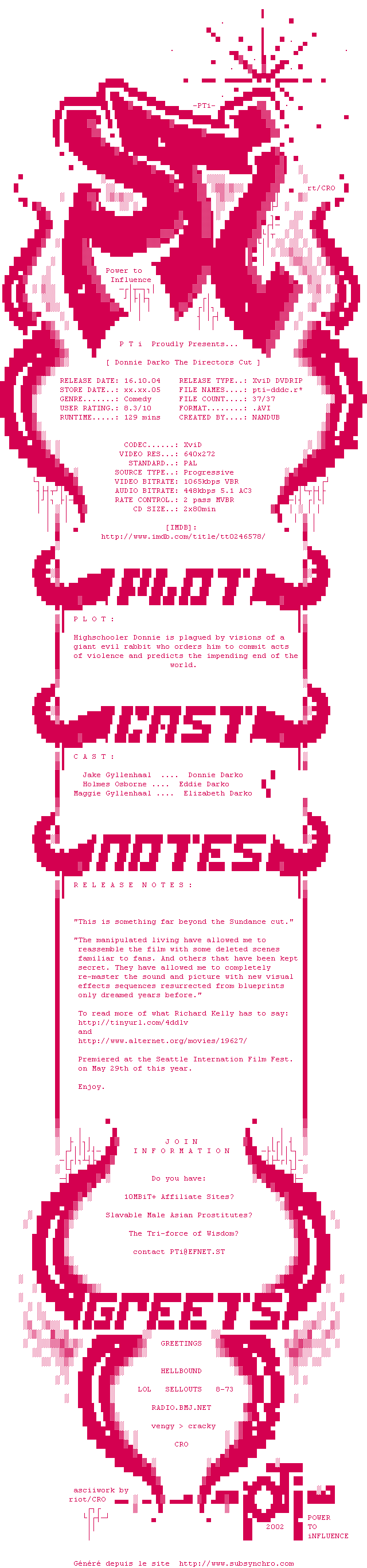 Donnie.Darko.Directors.Cut.2001.DVDRip.XviD-PTi.zip Ajouté par XeiS Ajoute le 10-05-2010 11:09:31 Format : ZIP Italique : Non Taille : 0.00Ko Telechargement : 144 Le fichier 52-1273482571.zip n'existe pas ! Ajouter cette release à ma collection en cas de telechargement des sous-titres 0 0 0 Telecharger le ZiP contenant NFO, Affiche, Sous-titre (*.zip) Commentez le fichier Donnie.Darko.Directors.Cut.2001.DVDRip.XviD-PTi.zip Commentez le fichier Donnie.Darko.Directors.Cut.2001.DVDRip.XviD-PTi.zip Commentez ce fichier Le fichier 52-1273482571.zip n'existe pas ! Telechargez le RSS « Fichier de la release Donnie.Darko.The.Directors.Cut.2004.DVDRip.XviD-PTi » Retour au film « Donnie Darko »