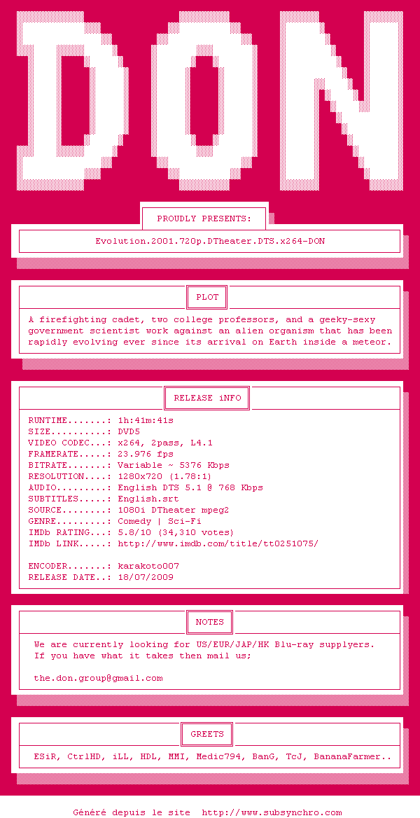 Telechargez le RSS « Fichier de la release Evolution.2001.720p.DTheater.DTS.x264-DON »