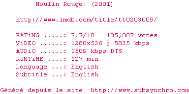 Moulin.Rouge.2001.720p.BluRay.x264-MELiTE.srt Ajouté par Inco Ajoute le 07-11-2010 20:52:20 Format : SRT Italique : Non Taille : 0.00Ko Telechargement : 240 Ajouter cette release à ma collection en cas de telechargement des sous-titres 0 0 0 Telecharger le ZiP contenant NFO, Affiche, Sous-titre (*.srt) Commentez le fichier Moulin.Rouge.2001.720p.BluRay.x264-MELiTE.srt Commentez le fichier Moulin.Rouge.2001.720p.BluRay.x264-MELiTE.srt Commentez ce fichier Le fichier 437-1289159540.srt n'existe pas ! Telechargez le RSS « Fichier de la release Moulin.Rouge.2001.720p.BluRay.x264-MELiTE » Retour au film « Moulin Rouge ! »