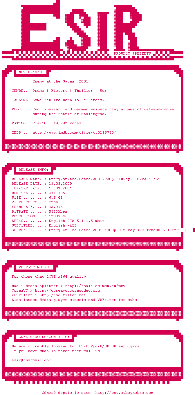 Telechargez le RSS « Fichier de la release Enemy.at.the.Gates.2001.720p.BluRay.DTS.x264-ESiR »