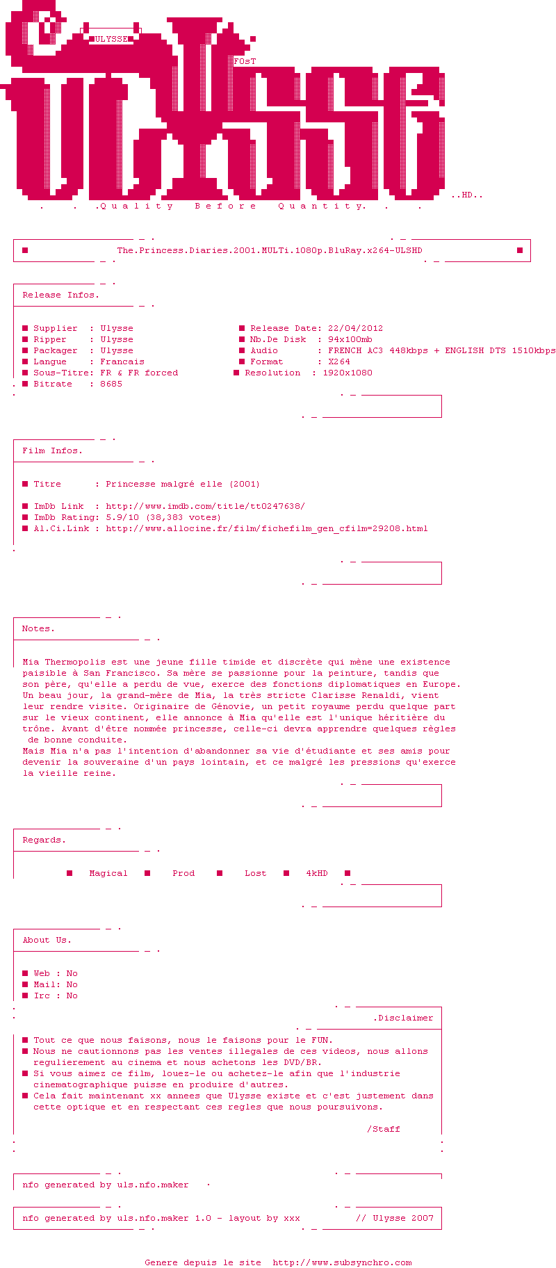 Y avez-vous pense ? Nous proposons déjà 2 sous-titres pour le film Princesse malgré elle. Avez-vous essaye de voir si ces sous-titres etaient compatibles avec cette release ? On vous laisse le soin de tester cela pour nous et de contribuer au site en postant le sous-titre en cas de compatiblite constatee !