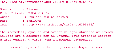 Voir le nfo de la release The.Rules.of.Attraction.2002.1080p.Bluray.x264-hV