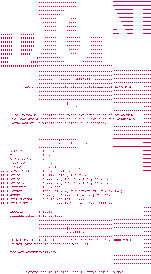 Voir le nfo de la release The.Rules.Of.Attraction.2002.MULTi.1080p.BluRay.x264-ROUGH