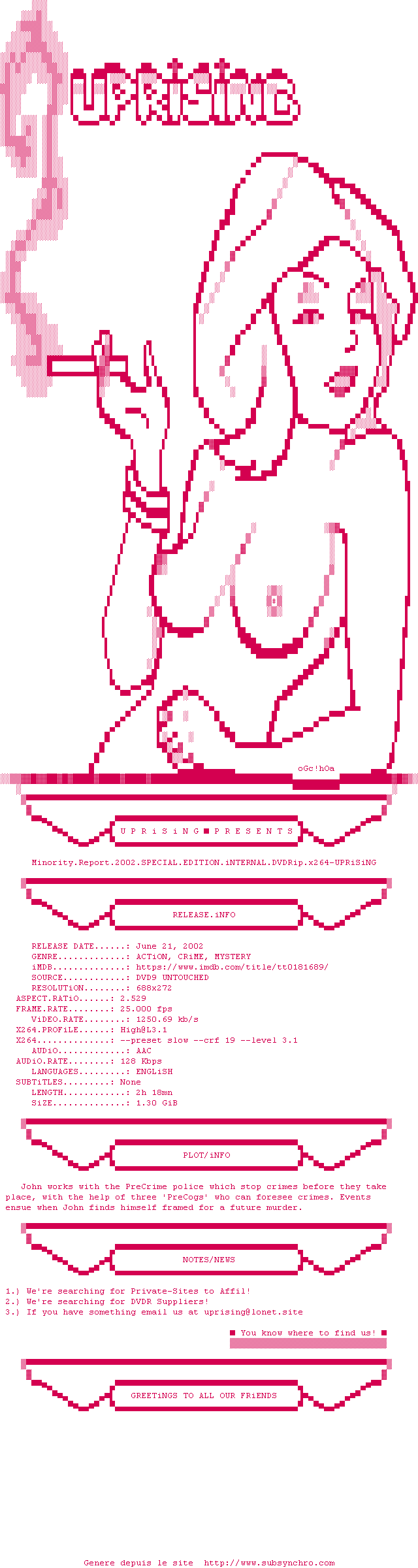 Voir le nfo de la release Minority.Report.2002.SPECIAL.EDITION.iNTERNAL.DVDRip.x264-UPRiSiNG