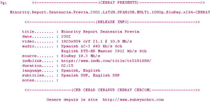 Voir le nfo de la release Minority.Report.Sentencia.Previa.2002.LATiN.SPANiSH.MULTi.1080p.BluRay.x264-CEBRAY