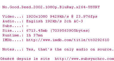 Voir le nfo de la release No.Good.Deed.2002.1080p.BluRay.x264-USURY