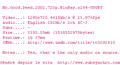 Voir le nfo de la release No.Good.Deed.2002.720p.BluRay.x264-USURY