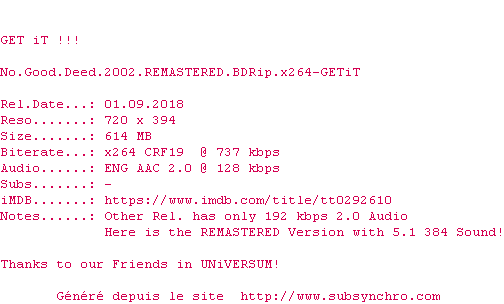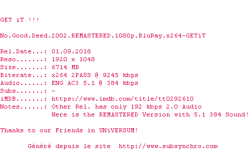 Voir le nfo de la release No.Good.Deed.2002.REMASTERED.BDRip.x264-GETiT