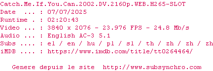 Le commentaire de Yaumegui Commente par Yaumegui (554), Le Mercredi 08 Mai 2013 à 00h09 L'un des derniers bon film de Spielberg. J'ai même aimé Leonardo DiCaprio et Tom Hanks. 9.5 / 10 1 0