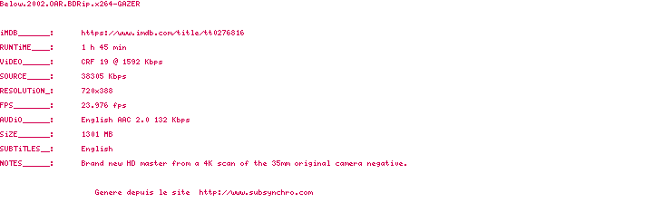 Voir le nfo de la release Below.2002.OAR.1080p.BluRay.x264-GAZER
