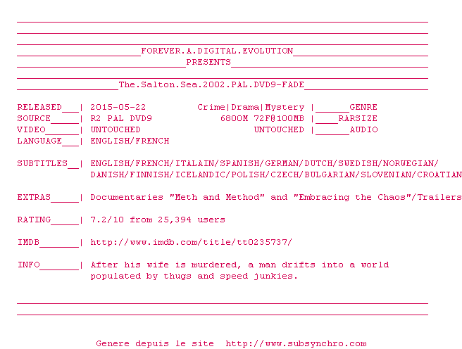 Voir le nfo de la release The.Salton.Sea.2002.PAL.DVD9-FADE