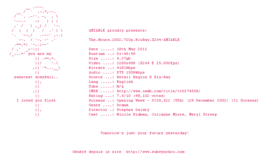 Voir le nfo de la release The.Hours.2002.720p.BluRay.X264-AMIABLE