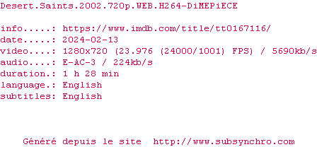 | Voir le nfo de la release Desert.Saints.2002.1080p.WEB.H264-DiMEPiECE | DiMEPiECE | Desert.Saints.2002.1080p.WEB.H264-DiMEPiECE OpenSubtitles | 0 fichier |