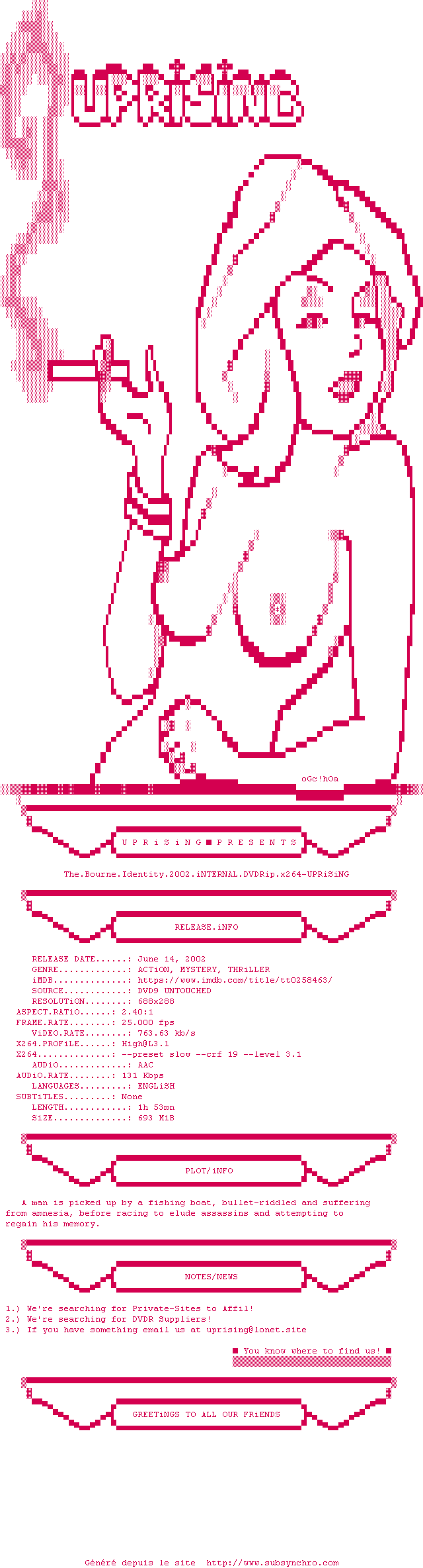 Voir le nfo de la release The.Bourne.Identity.2002.iNTERNAL.DVDRip.x264-UPRiSiNG