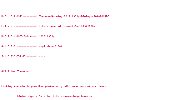Voir le nfo de la release Tornado.Warning.2012.1080p.BluRay.x264-SONiDO