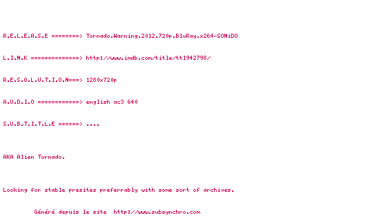Voir le nfo de la release Tornado.Warning.2012.720p.BluRay.x264-SONiDO