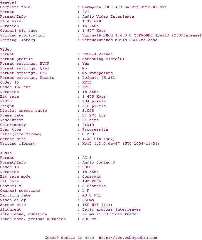 Voir le nfo de la release Champion.2002.AC3.DVDRip.XviD-SUBS_BP