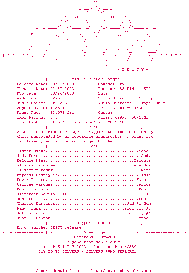 | Voir le nfo de la release Raising.Victor.Vargas.LiMiTED.DVDRip.XViD-DEiTY | DEiTY | Raising.Victor.Vargas.LiMiTED.DVDRip.XViD-DEiTY OpenSubtitles | 0 fichier | ||