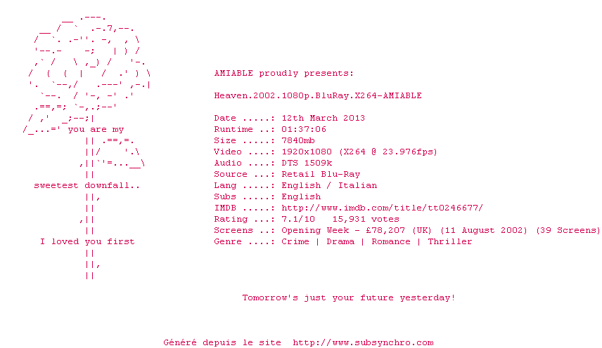 | Voir le nfo de la release Heaven.2002.1080p.BluRay.x264-AMIABLE | AMIABLE | Heaven.2002.1080p.BluRay.x264-AMIABLE OpenSubtitles | 0 fichier | ||