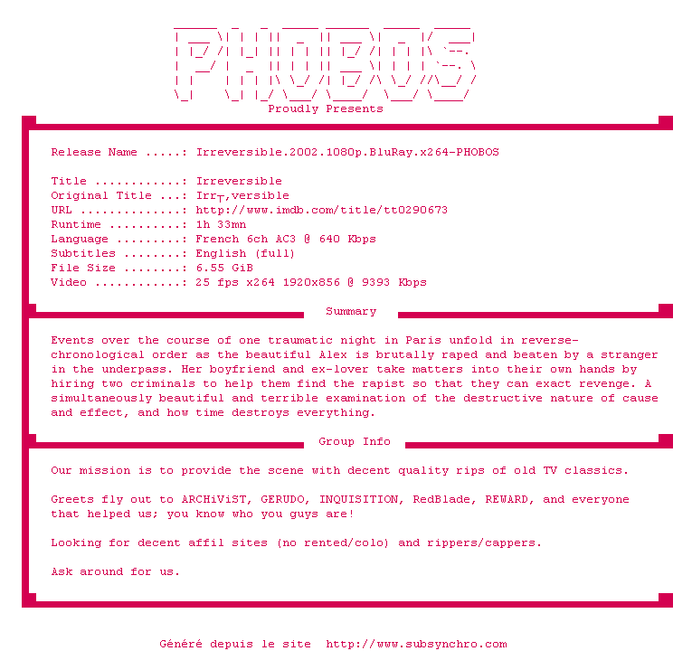 Voir le nfo de la release Irreversible.2002.1080p.BluRay.x264-PHOBOS