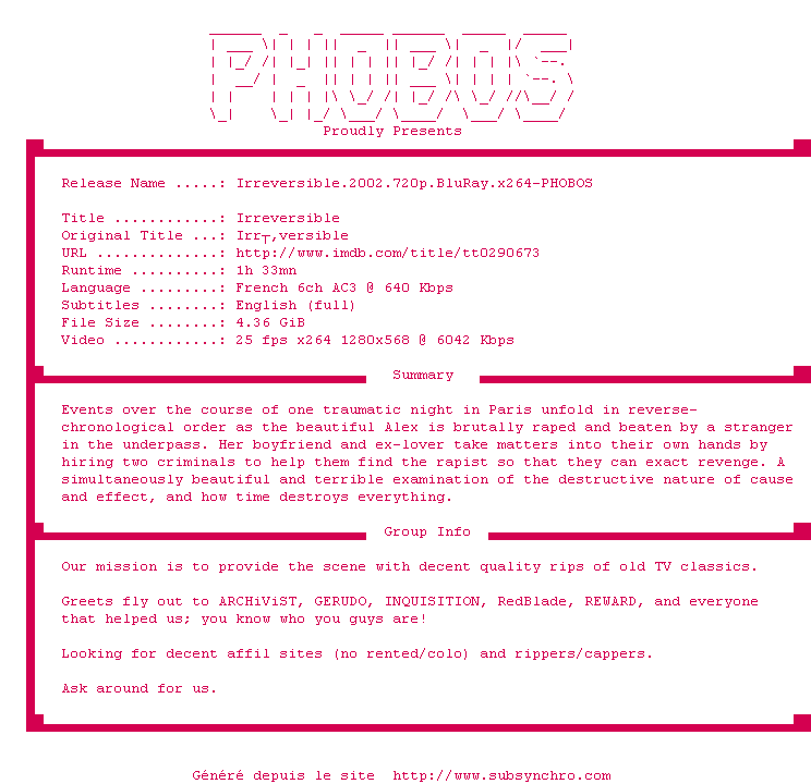Voir le nfo de la release Irreversible.2002.720p.BluRay.x264-PHOBOS