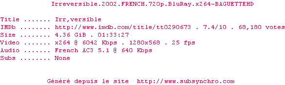 Voir le nfo de la release Irreversible.2002.FRENCH.1080p.BluRay.x264-BAGUETTEHD