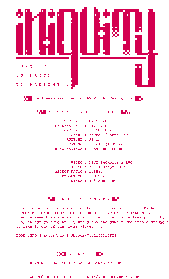Halloween.Resurrection.DVDRip.DivX-iNiQUiTY.srt Ajouté par XeiS Ajoute le 15-01-2010 04:30:45 Format : SRT Italique : Non Taille : 0.00Ko Telechargement : 70 Ajouter cette release à ma collection en cas de telechargement des sous-titres 0 0 0 Telecharger le ZiP contenant NFO, Affiche, Sous-titre (*.srt) Commentez le fichier Halloween.Resurrection.DVDRip.DivX-iNiQUiTY.srt Commentez le fichier Halloween.Resurrection.DVDRip.DivX-iNiQUiTY.srt Commentez ce fichier Le fichier 52-1263526245.srt n'existe pas ! Telechargez le RSS « Fichier de la release Halloween.Resurrection.DVDRip.DivX-iNiQUiTY » Retour au film « Halloween: Resurrection »
