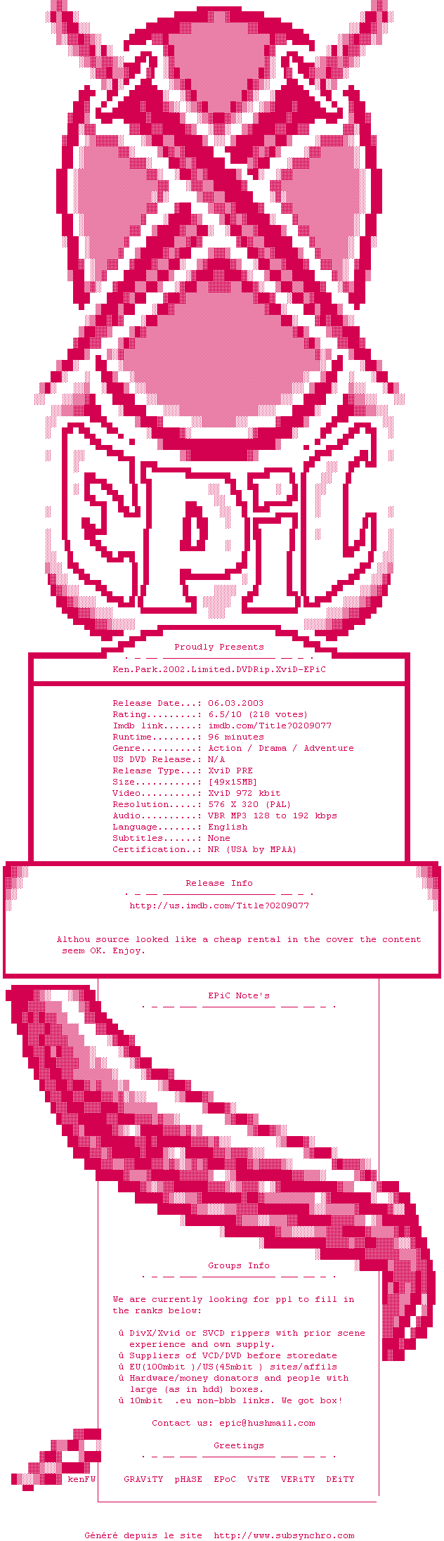 Ken.Park.2002.Limited.DVDRip.XviD-EPiC.SRT Ajouté par Ash-D Ajoute le 15-02-2012 00:43:38 Format : SRT Italique : Non Taille : 0.00Ko Telechargement : 176 Sous-titre « Fansub » Ajouter cette release à ma collection en cas de telechargement des sous-titres 0 0 0 Telecharger le ZiP contenant NFO, Affiche, Sous-titre (*.SRT) Commentez le fichier Ken.Park.2002.Limited.DVDRip.XviD-EPiC.SRT Commentez le fichier Ken.Park.2002.Limited.DVDRip.XviD-EPiC.SRT Commentez ce fichier Le fichier 5472-1329263018.srt n'existe pas ! Telechargez le RSS « Fichier de la release Ken.Park.2002.Limited.DVDRip.XviD-EPiC » Retour a la release « Ken.Park.2002.Limited.DVDRip.XviD-EPiC »