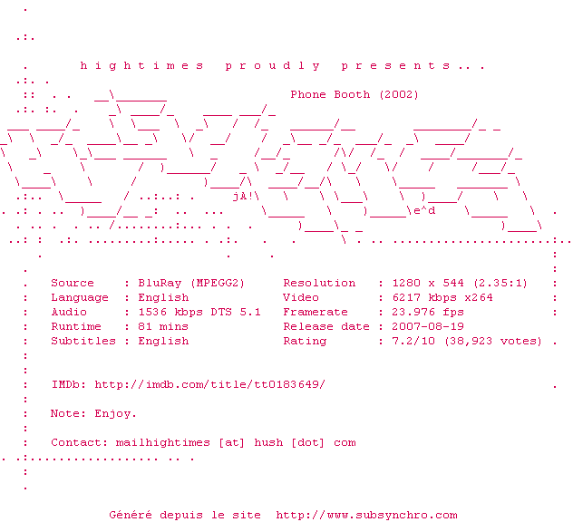 Phone.Booth.2002.720p.BluRay.x264-HiGHTiMES.srt Ajouté par XeiS Ajoute le 07-01-2010 17:38:12 Format : SRT Italique : Non Taille : 0.00Ko Telechargement : 258 Ajouter cette release à ma collection en cas de telechargement des sous-titres 0 0 0 Telecharger le ZiP contenant NFO, Affiche, Sous-titre (*.srt) Commentez le fichier Phone.Booth.2002.720p.BluRay.x264-HiGHTiMES.srt Commentez le fichier Phone.Booth.2002.720p.BluRay.x264-HiGHTiMES.srt Commentez ce fichier Le fichier 52-1262882292.srt n'existe pas ! Telechargez le RSS « Fichier de la release Phone.Booth.2002.720p.BluRay.x264-HiGHTiMES » Retour au film « Phone Game »