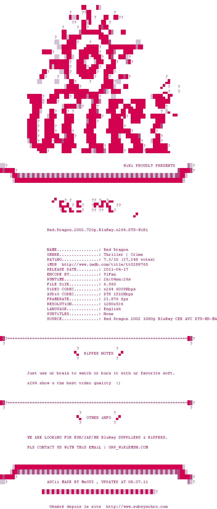 Telechargez le RSS « Fichier de la release Red.Dragon.2002.720p.BluRay.x264.DTS-WiKi »