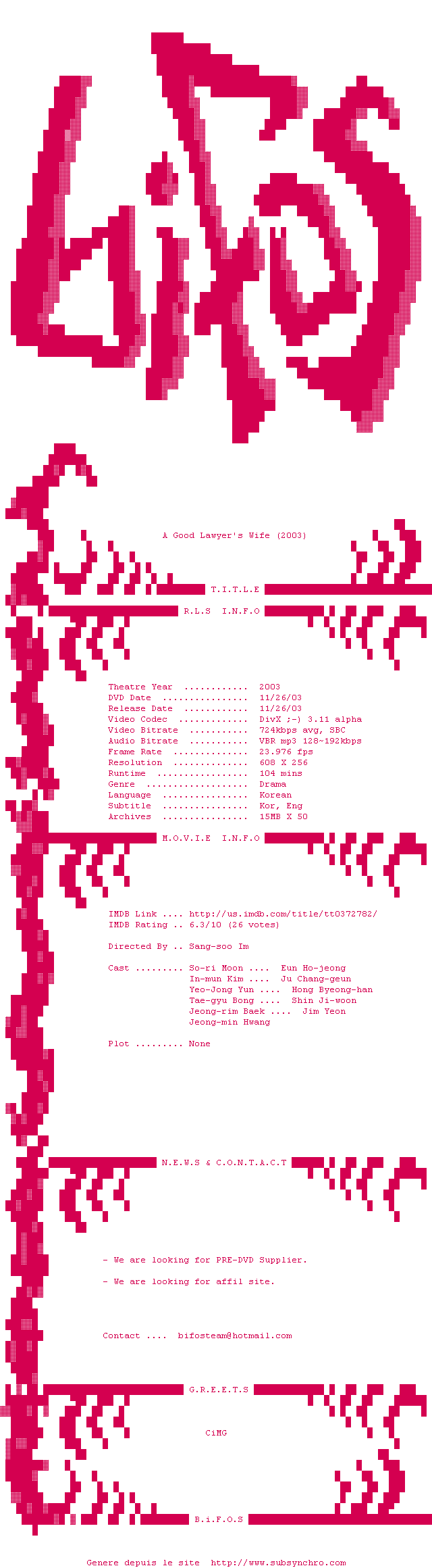 | Voir le nfo de la release A.Good.Lawyers.Wife.DVDRip.DivX-BiFOS | BiFOS | A.Good.Lawyers.Wife.DVDRip.DivX-BiFOS OpenSubtitles | 0 fichier | ||