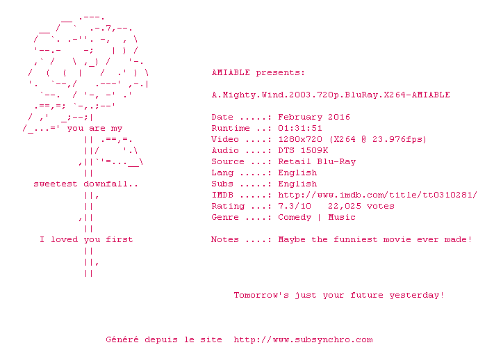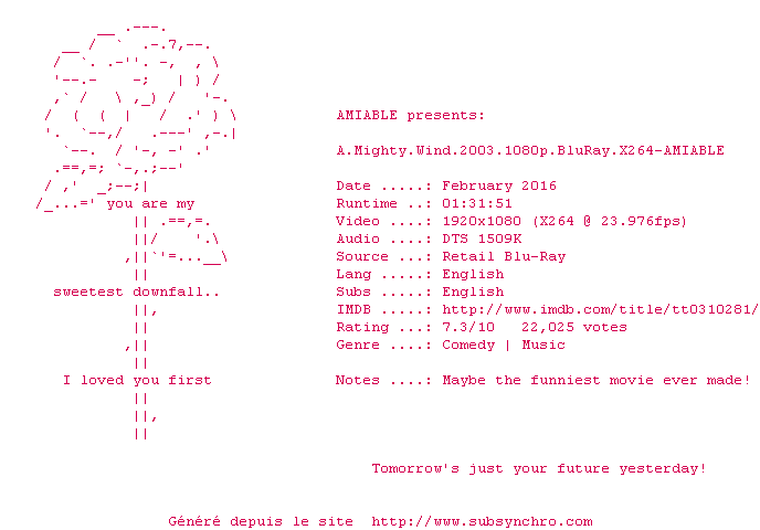 | Voir le nfo de la release A.Mighty.Wind.2003.1080p.BluRay.x264-AMIABLE | AMIABLE | A.Mighty.Wind.2003.1080p.BluRay.x264-AMIABLE OpenSubtitles | 0 fichier | ||